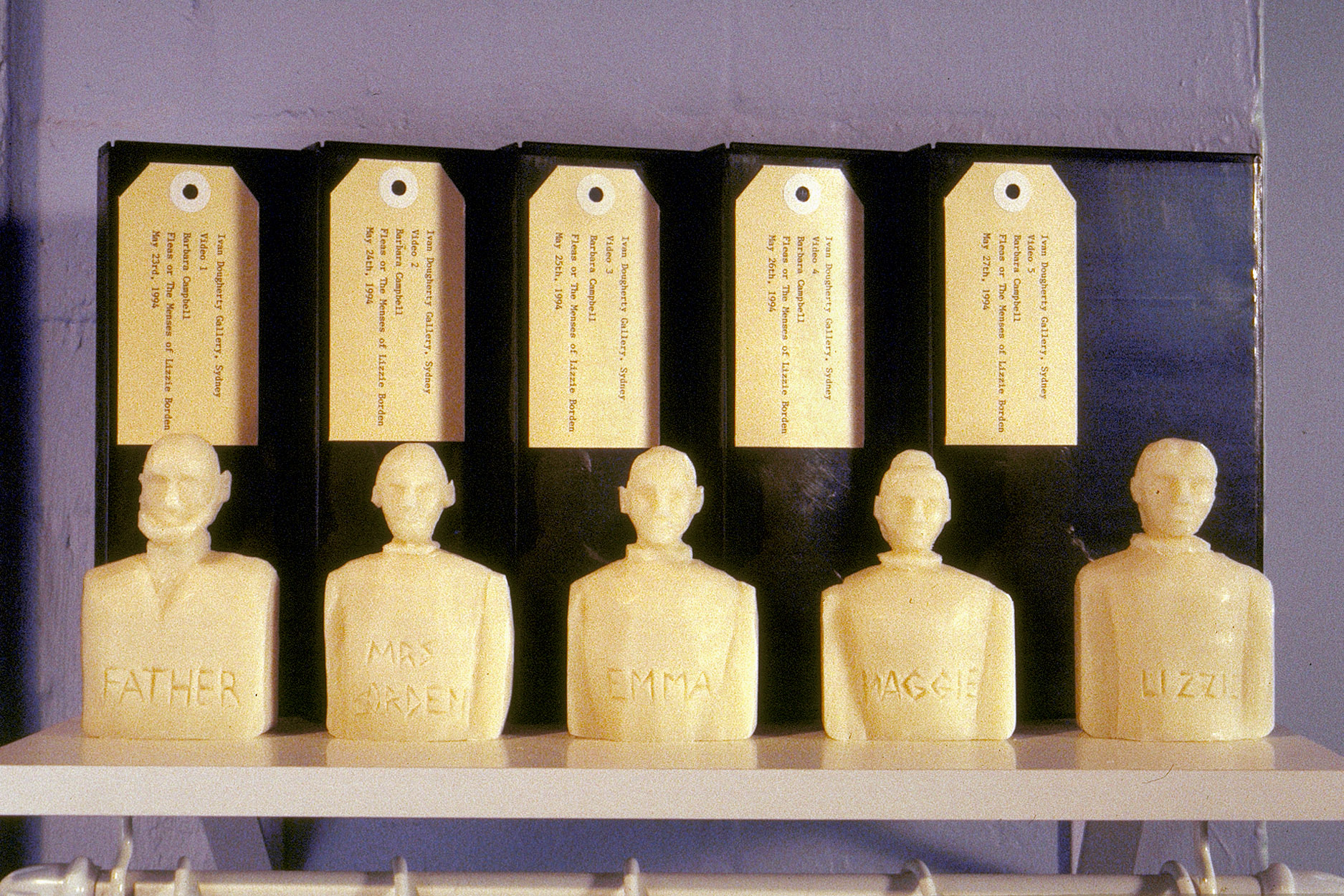 The performance played out over a five day period with Campbell wearing a different dress each day and carving a soap sculpture effigy of each member of the Borden household. The actions were only seen through a live feed video. The “evidence” of the actions was tagged and displayed in the gallery at the end of each day.