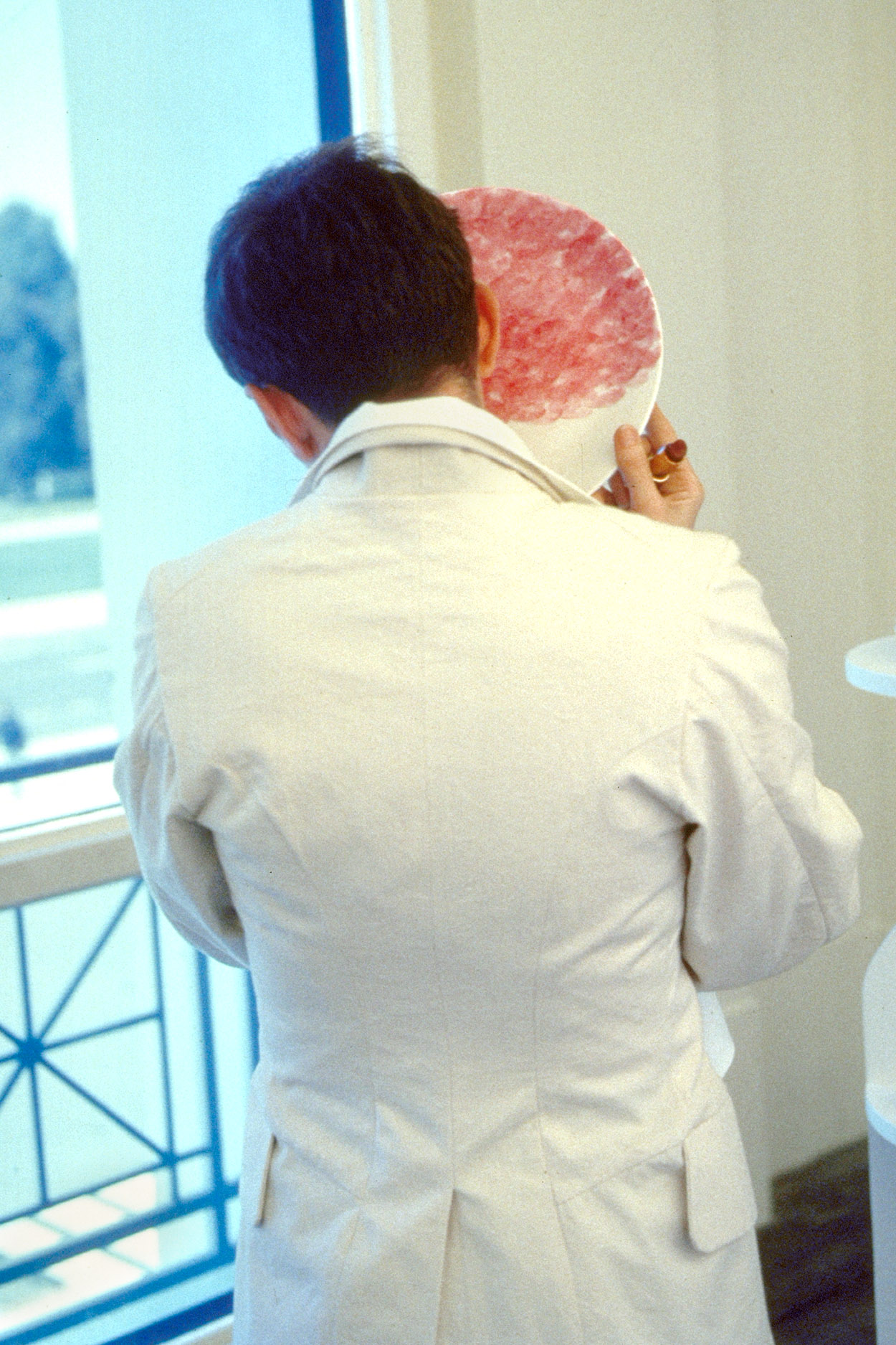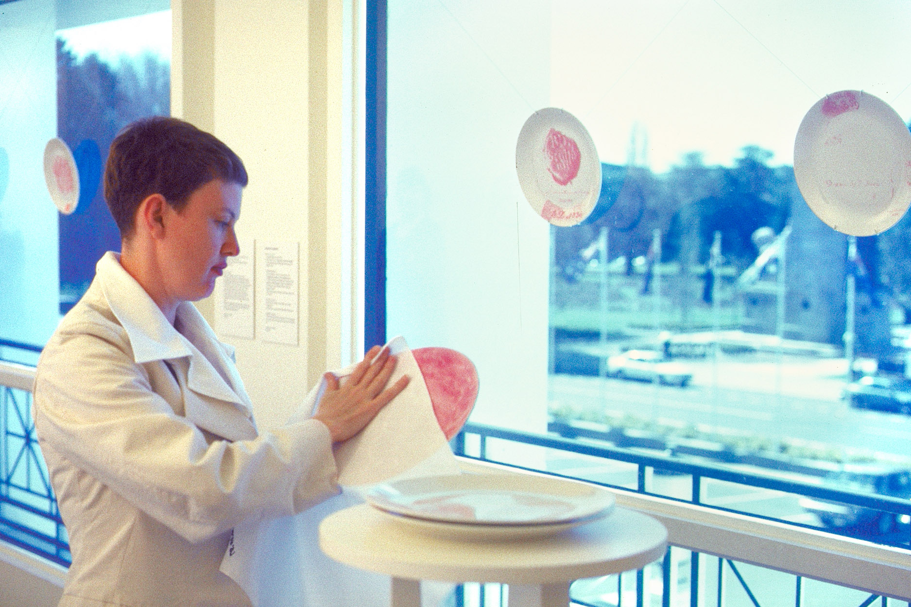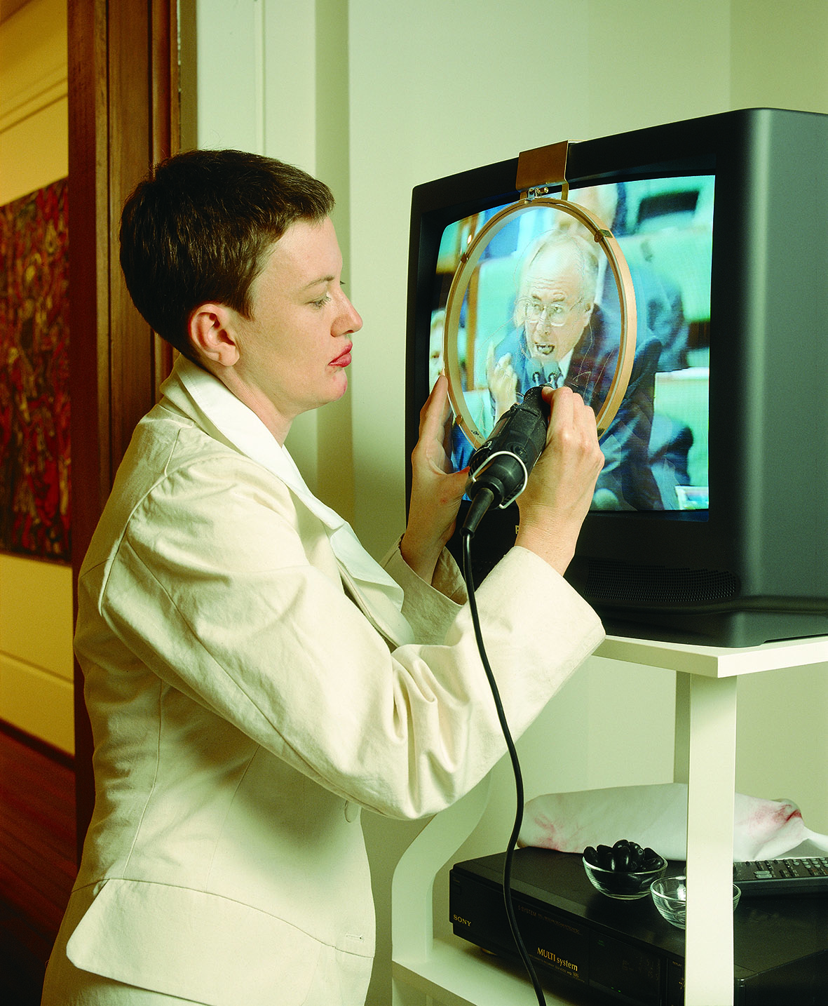 In this series of performances and exhibits, two sets of portraits were made during an eight day sitting period of Australia’s Federal Parliament. One set, revealed by Campbell kissing and wiping clean lipstick-coated dinner plates, were the accumulated signatures of 19th century portrait-makers of the Palawa woman Trukanini. The other set—engravings on acrylic with masticated black jelly-beans rubbed in—were portraits of politicians frozen by the video recorder during ABC broadcasts of Parliamentary Question Time.