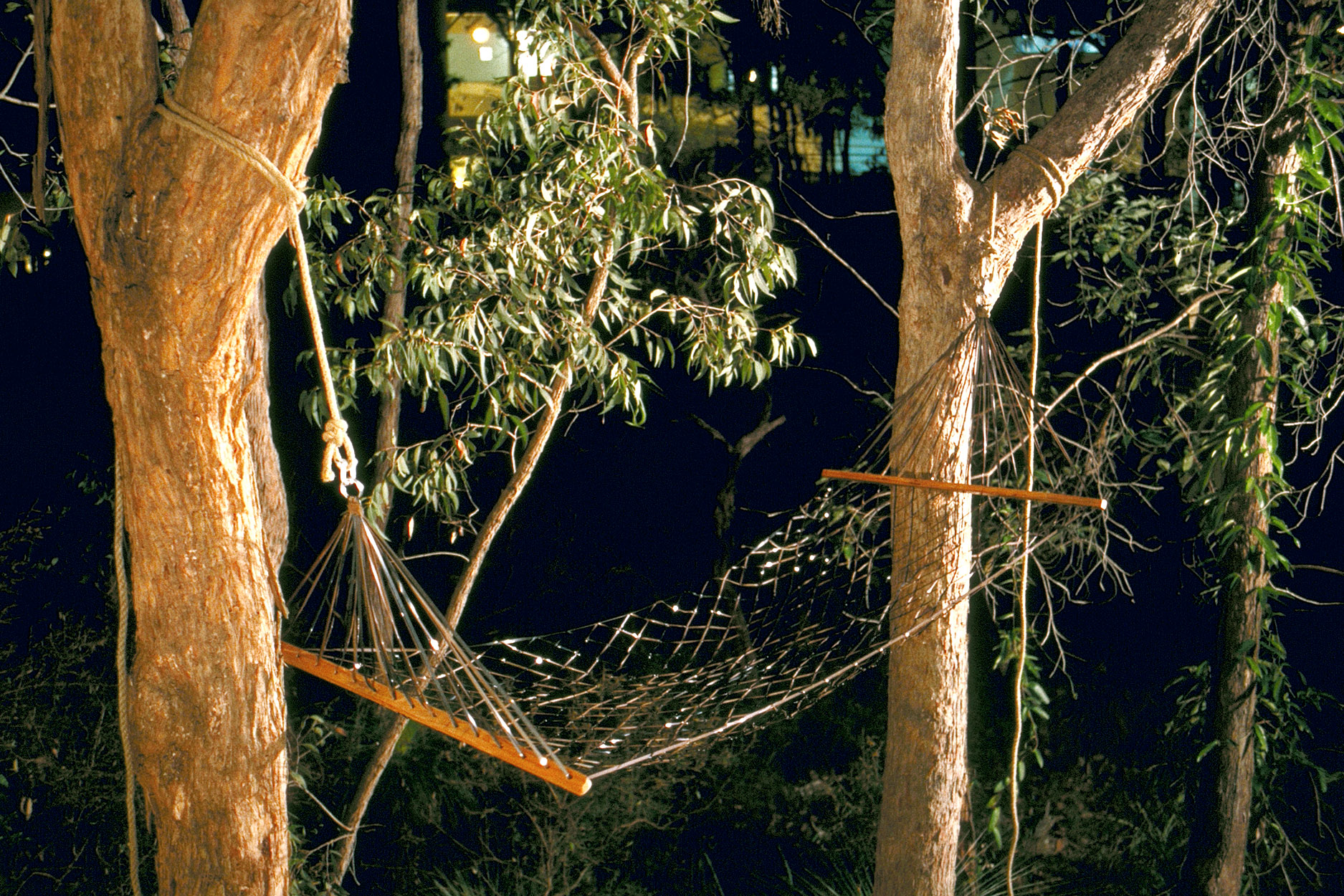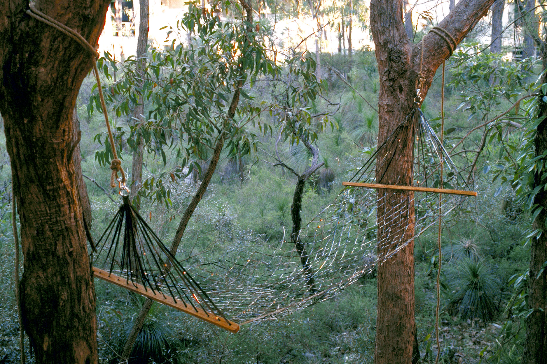 The hammock, with its open diamond weave has long been a casual form of bedding for the outdoors. Simple hessian hammocks were reportedly favoured by the Heidelberg painters during their famous artists’ camps. In Lozenge, the recurring narrative of being lost in the bush, so frequently illustrated by artists and writers in the 19th century, shifts to one of loss in the bush in the 20th century.