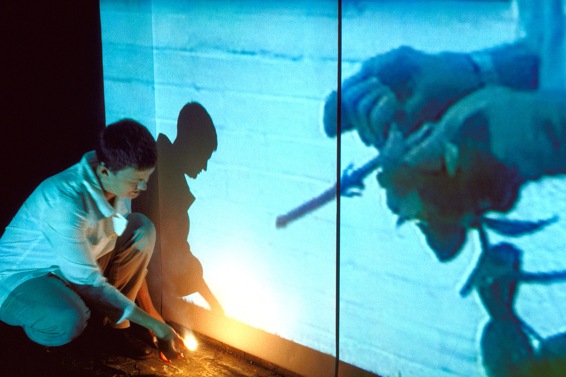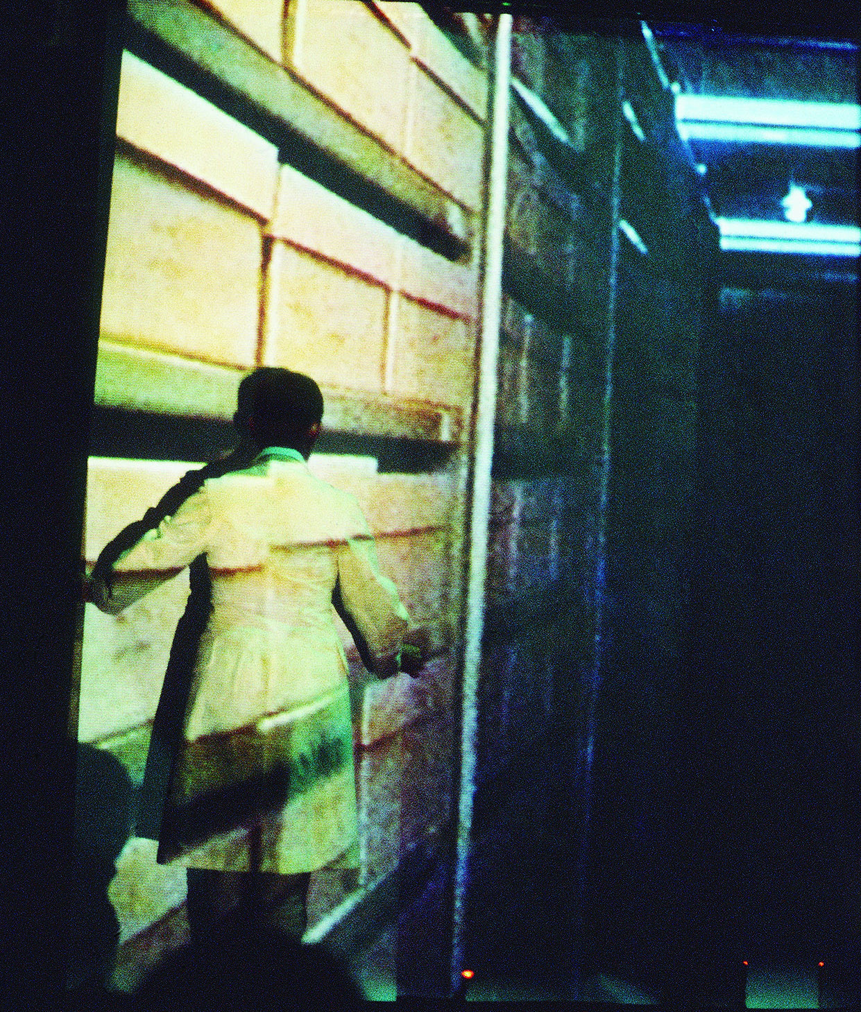 The artist projects her film on the side of the building, and solid matter becomes liquid, begins to move. In the projection, Barbara’s grandfather is dowsing for water. He walks a few steps and his forked branch moves from an erect position to point down. He has located water. If there is any surprise about the image, it is that it is so very ordinary. If there is magic, it is in the transformation of materials by means of projected light and movement.